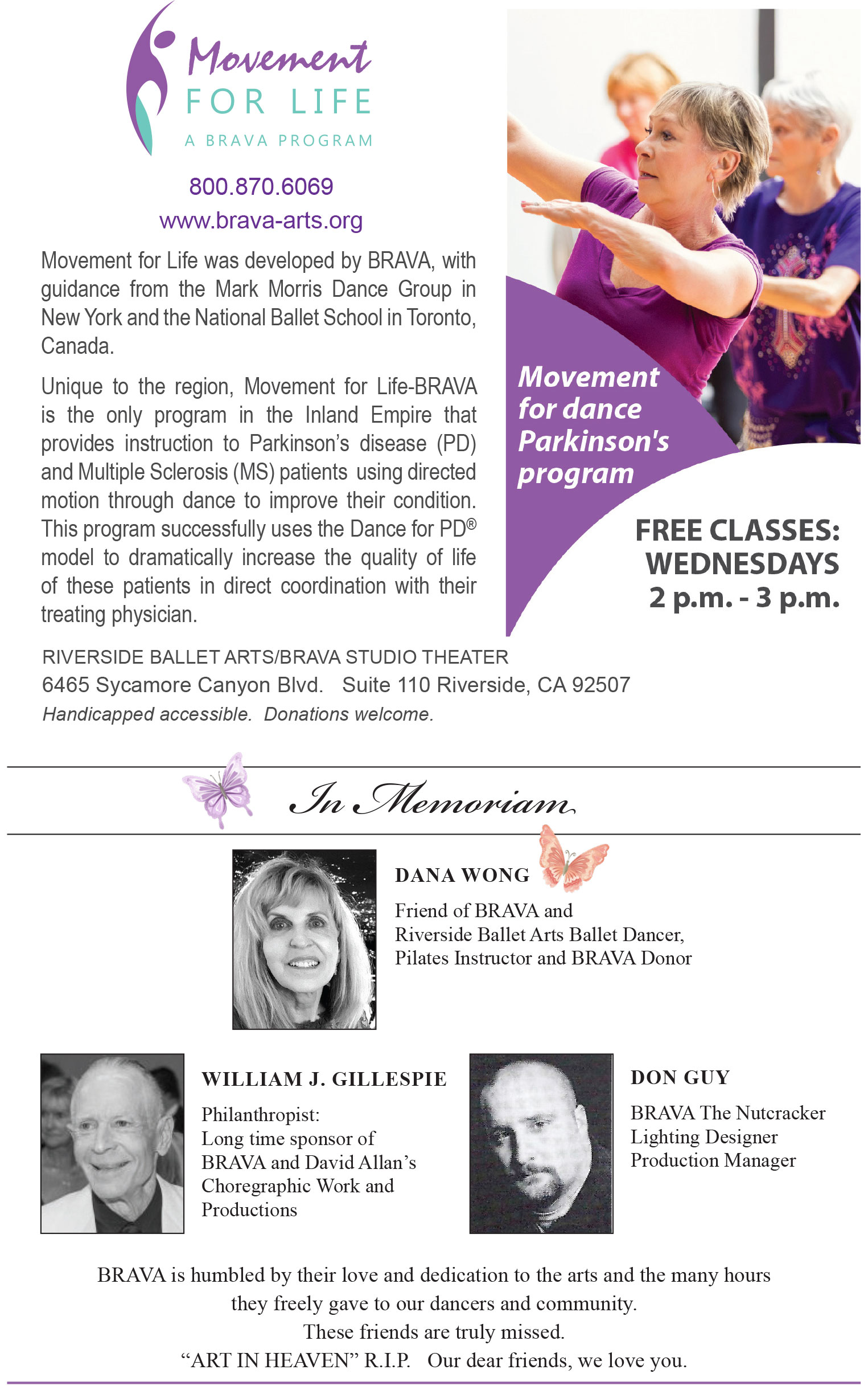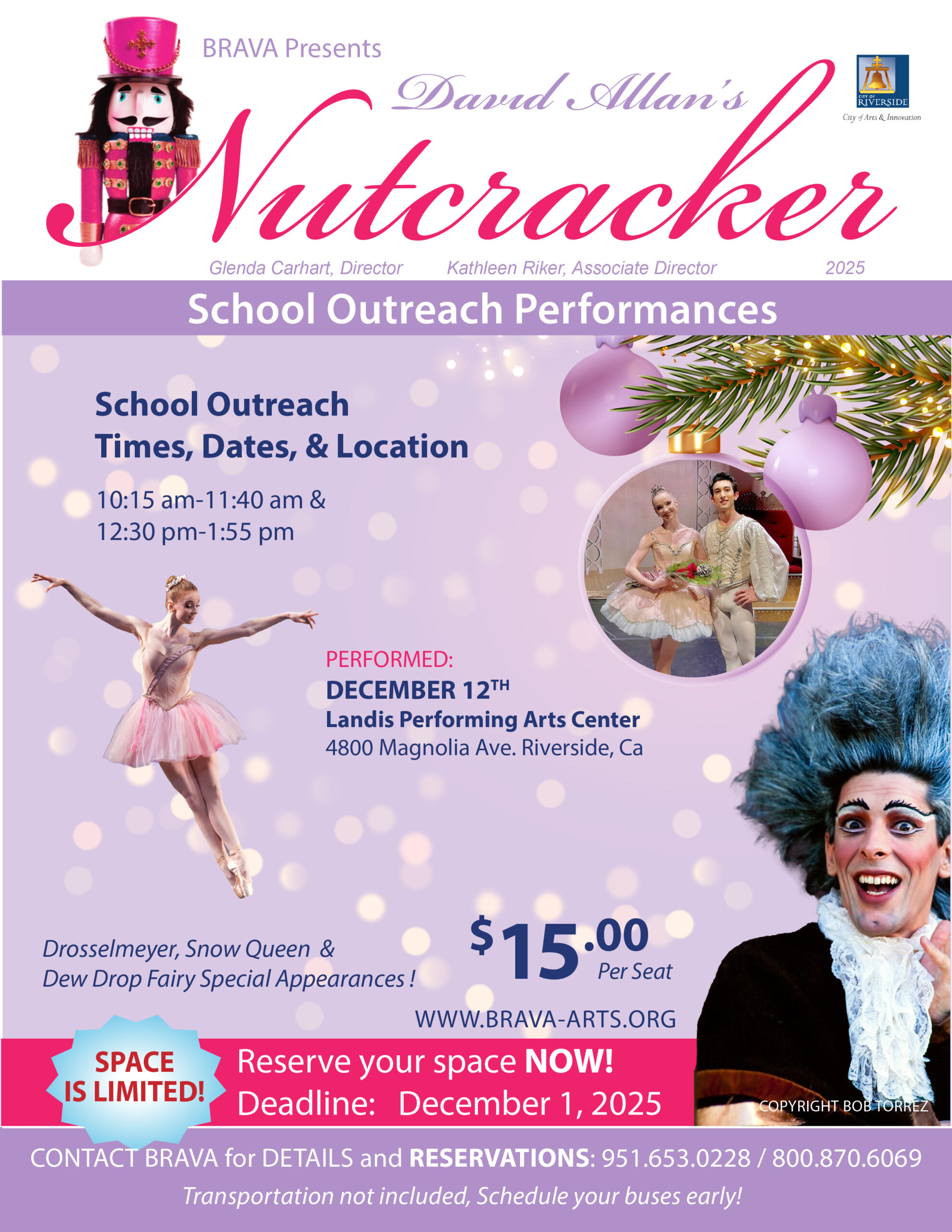 BRAVA is a Non-Profit 501-c3 organization dedicated to arts including: Mentoring, Scholarships, Workshops, Choreography, Performing Opportunities, Community Outreach with emphasis on children and youth. And proud of The David Allan’s Nutcracker performed in Riverside, CA